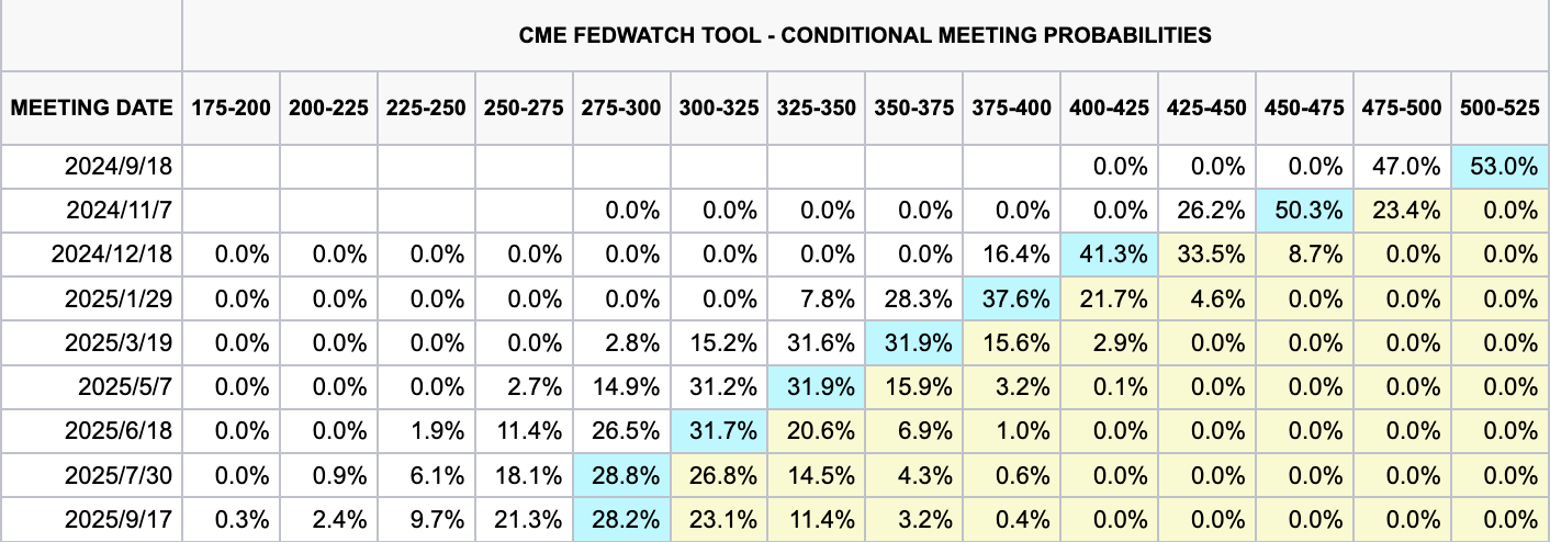 目前,華爾街對於降息的幅度仍然有不同的看法。債券交易員於 CME FedWatch 上預計降息 25 點的機率為 53%,降息 50 點的機率為 47%,相當接近。
