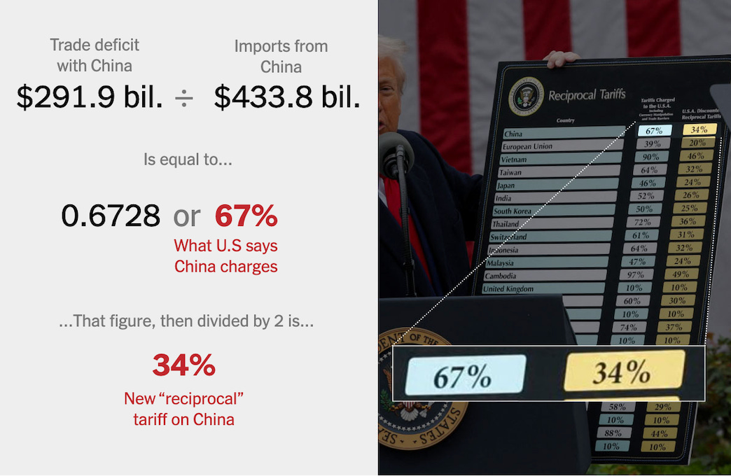 對等關稅 = 貿易赤字比的一半 = 64% / 2 = 32%