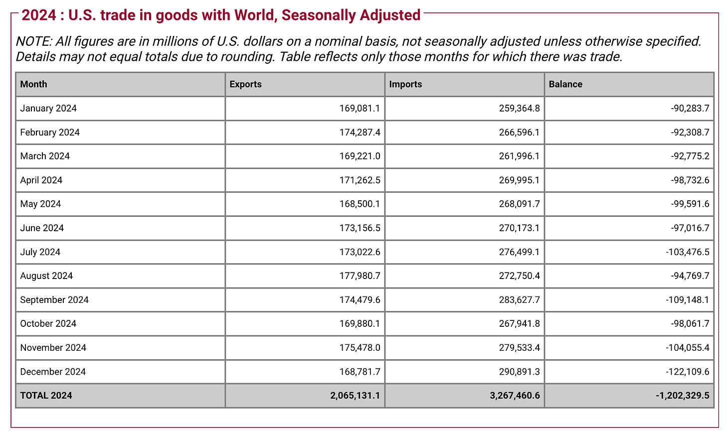 表三 2024年:美國的出口、進口和貿易逆差(百萬美元)