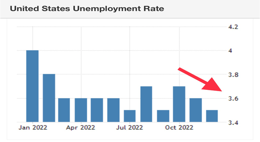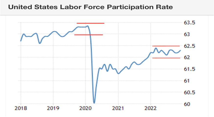 據估計,在疫情期間,美國有 2 百萬到 4 百萬勞工因各種原因離開職場,造成勞工市場供給不足,勞工短缺。勞動參與率降低從疫情前的 63.0%~63.5%下降到目前的 62.0%~62.5%” (表七 勞動參與率)。以總人口數 3 億人簡單計算,較少的勞動力約為 3 百萬人,與估計大致相符。造成的結果是,12 月的失業率不升反降,降低到了歷史低點的 3.5%(表八 失業率)。