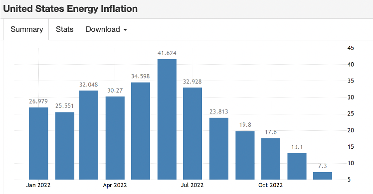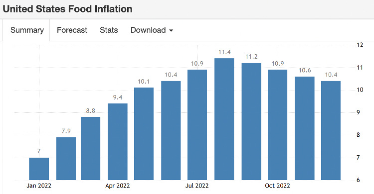 從分項來看,能源的通膨上漲了 7.3%,遠低於11月的13.1%,這也是自 2021 年 2 月以來的最低值 (表二 能源價格通貨膨脹率)。其中,最主要是汽油的價格的下跌了 -1.5%,(vs 10.1%) 和燃料油價格的上漲放緩至 41.5% (vs 65.7%) 的影響。但是,電力 (14.3% vs 13.7%) 和天然氣 (19.3% vs 15.5%) 的通膨仍然上升。食品價格的通膨放緩至10.4%( vs 10.6%) (表三 食品價格通貨膨脹率),二手車和卡車價格下降 -8.8% (vs -3.3%), 新車價格上漲 5.9%,服裝類緩漲 2.9%。