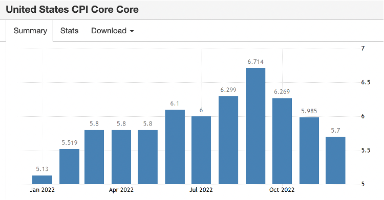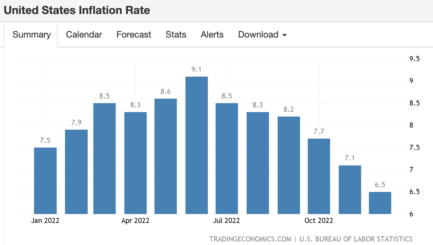 美國勞工統計局於 1 月 12 日公布 12 月份的年度通脹率爲 6.5%, 是 6 月份峰值 9.1% 以來連續第六個月下降,也是 2021 年 10 月份以來的最低水平,符合市場預期 (表一 通貨膨脹率)。
