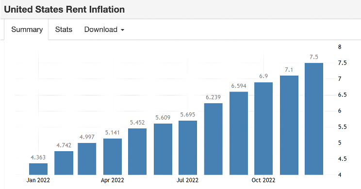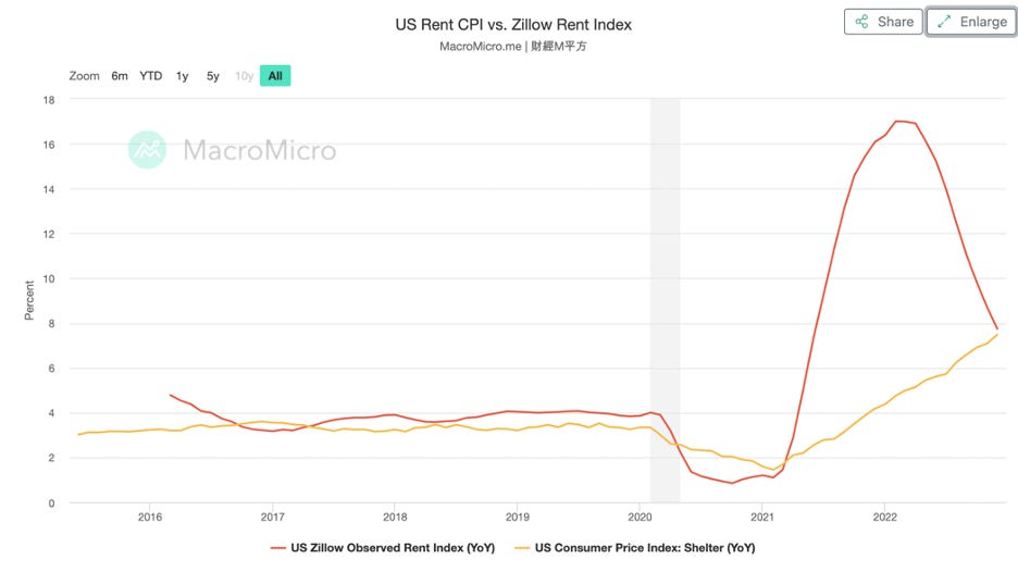 然而,從美國勞工局的計算通膨的組成結構來看 (表十 通膨組成的結構),能源的價格僅僅佔整體通膨的 7.5%。目前,能源通膨的改善固然對通膨有幫助,但可以說是改善了小部分的問題。同時,能源價格通膨的改善主要來自於汽油的價格下降,而汽油的價格又受國際原油價格下跌的影響,不完全是在因為聯準會加息而造成。同時,食品價格佔整體CPI 價格的組成約 14%,而12月食品價格的通膨還在 10% 左右。更重要的是,住房價格佔整體通膨的三分之一,而且還在上升中,而住房價格的通貨膨脹在12月上漲了 7.5%,而且還在上升。