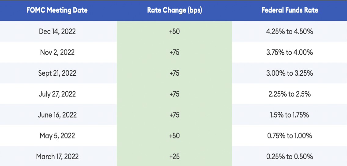 為了控制通膨,聯準會從 2022 年 3 月 17 日的已經七度加息 (表九 聯準會的加息進程與聯邦資金利率的變化)。在 2022 年 12 月的FOMC會議上,聯準會宣佈加息 50 bps ,聯邦資金利率從年初的 0% 到 0.25%上升到 4.25%~4.50%,已經是 15 年以來最高。