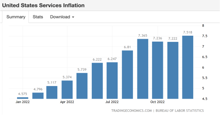 果然沒錯,服務類的通膨在 12 月不降反升,從 11 月的 7.2% 反而上升到 12月的 7.5% (表五 服務類價格的通貨膨脹)。其中,住房價格上漲了 7.5%,不但高於 11 月的 7.1%,而且還沒有看到下降的趨勢 (表六 住房價格的通貨膨脹)。交通運輸服務的價格也較去年同期上升了14.6%,而醫療保健服務的價格增加的幅度較整體較小只有 4.1%,