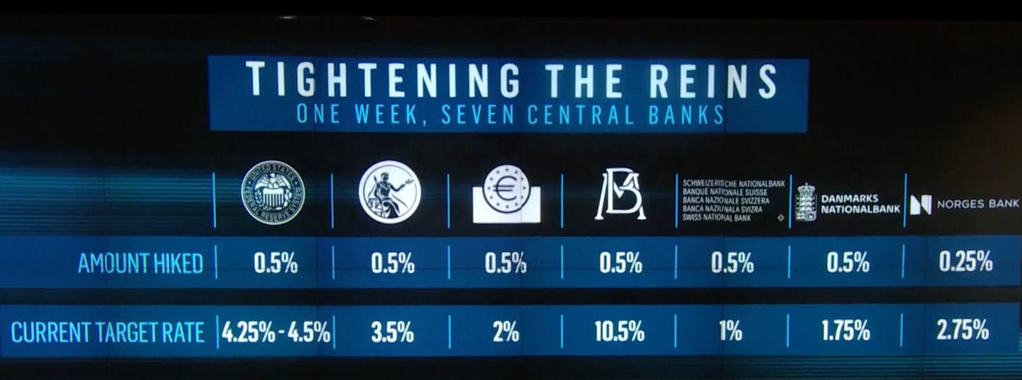 12 月底,億萬富豪投資人 David Tepper 在接受 CNBC 專訪時表示,最近通膨的下降固然是好事,人們也因為這樣感到興奮。但是,勞工市場出現結構性的變化,我們的勞工短缺,可能造成部分的通膨。因此,通膨一旦下降到一定的程度,將變得非常頑強,緊張的勞工市場將成為通膨的來源。也因此,聯準會、歐盟央行、英格蘭銀行都在收緊貨幣政策,並表明未來將繼續緊縮(表一 各國央行目前加息的情況)。Tepper 說,全球央行同時緊縮並不多見,而且,各國央行一直在告訴人們他們要做什麼,你應該要相信他們。但是,市場似乎不相信央行。