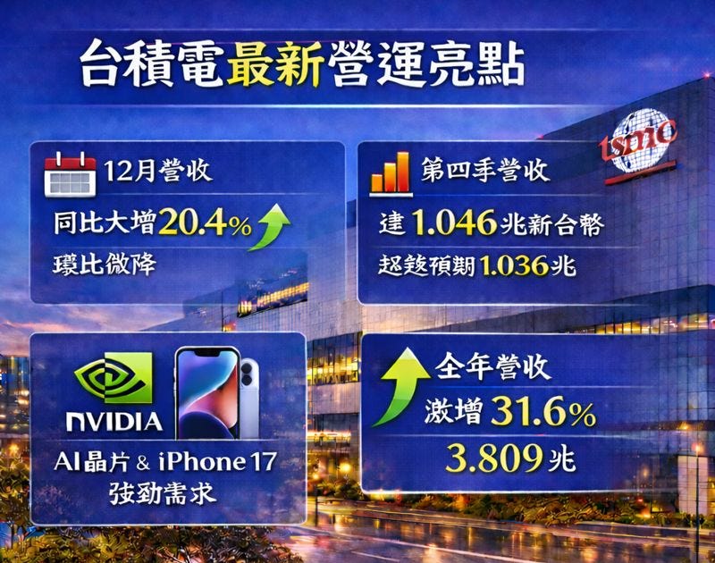 台積電於 2026 年 1 月 9 日公佈了其 2025 年 12 月及全年的營收數據。根據最新數據顯示,12 月營收雖環比微降,但同比大增 20.4%,預計助推第四季度總營收達 1.046 兆新臺幣,超越市場預期的 1.036 萬億。得益於 Nvidia AI 晶片與 iPhone 17 的強勁需求,公司全年營收 3.809 兆激增 31.6%,有效緩解了市場對AI基建「泡沫化」的擔憂。