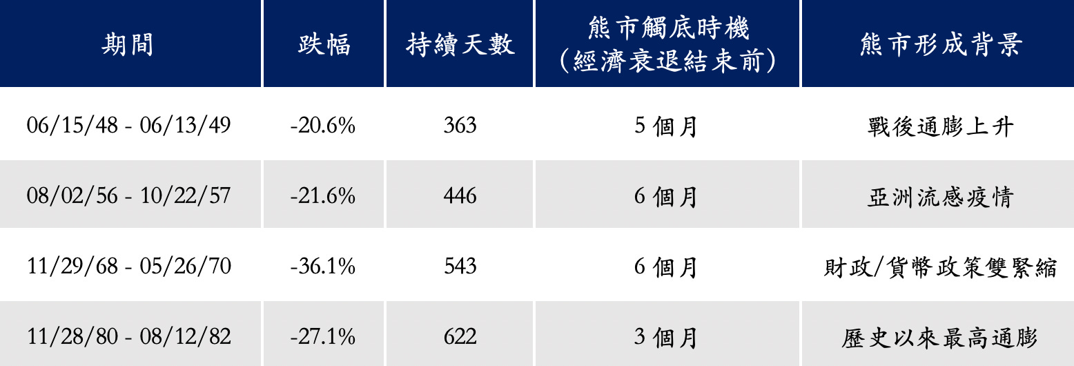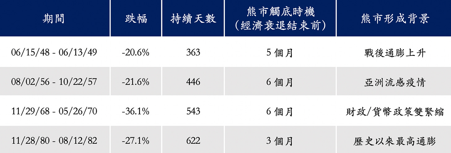 我們看到,除了 80 年代初期通膨達到歷史高點的約 15%,造成聯準會四次將聯邦資金利率加到 20%,造成經濟在 1980 年和 1982 年出現二次衰退以外,熊市長達 20 個月以外,另外三次熊市下跌持續的時間約在一年到一年半之間。