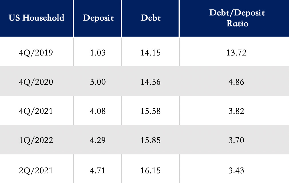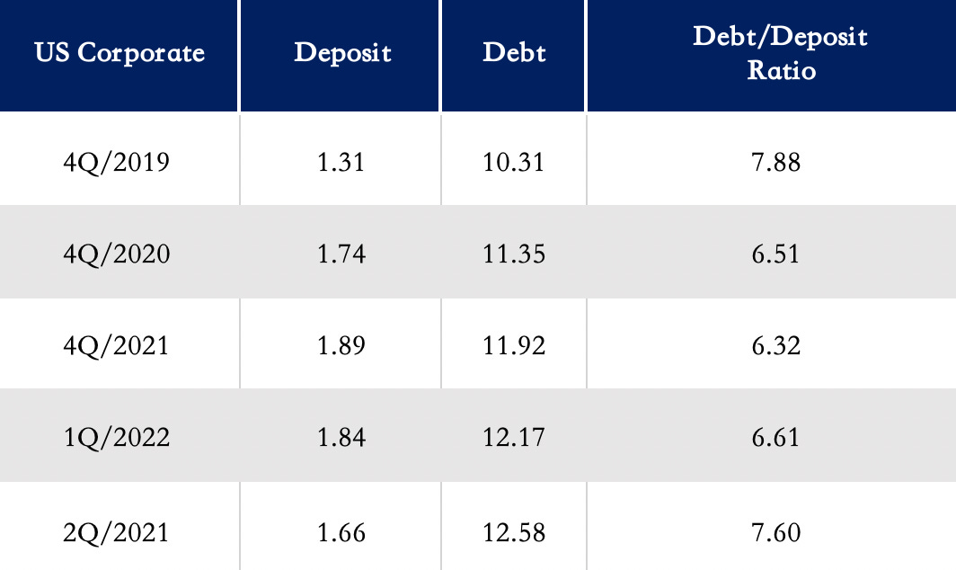 與歐洲和中國大陸不斷惡化的前景相比,由於能源獨立與之前的財政刺激計劃,美國的經濟目前反而處於相對較佳的位置。美國企業第二季度負債與存款比為 7.60 倍,已經逐漸回升到疫情前的 7.88 倍,仍屬健康的範圍(表四 美國企業負債與存款結構)。