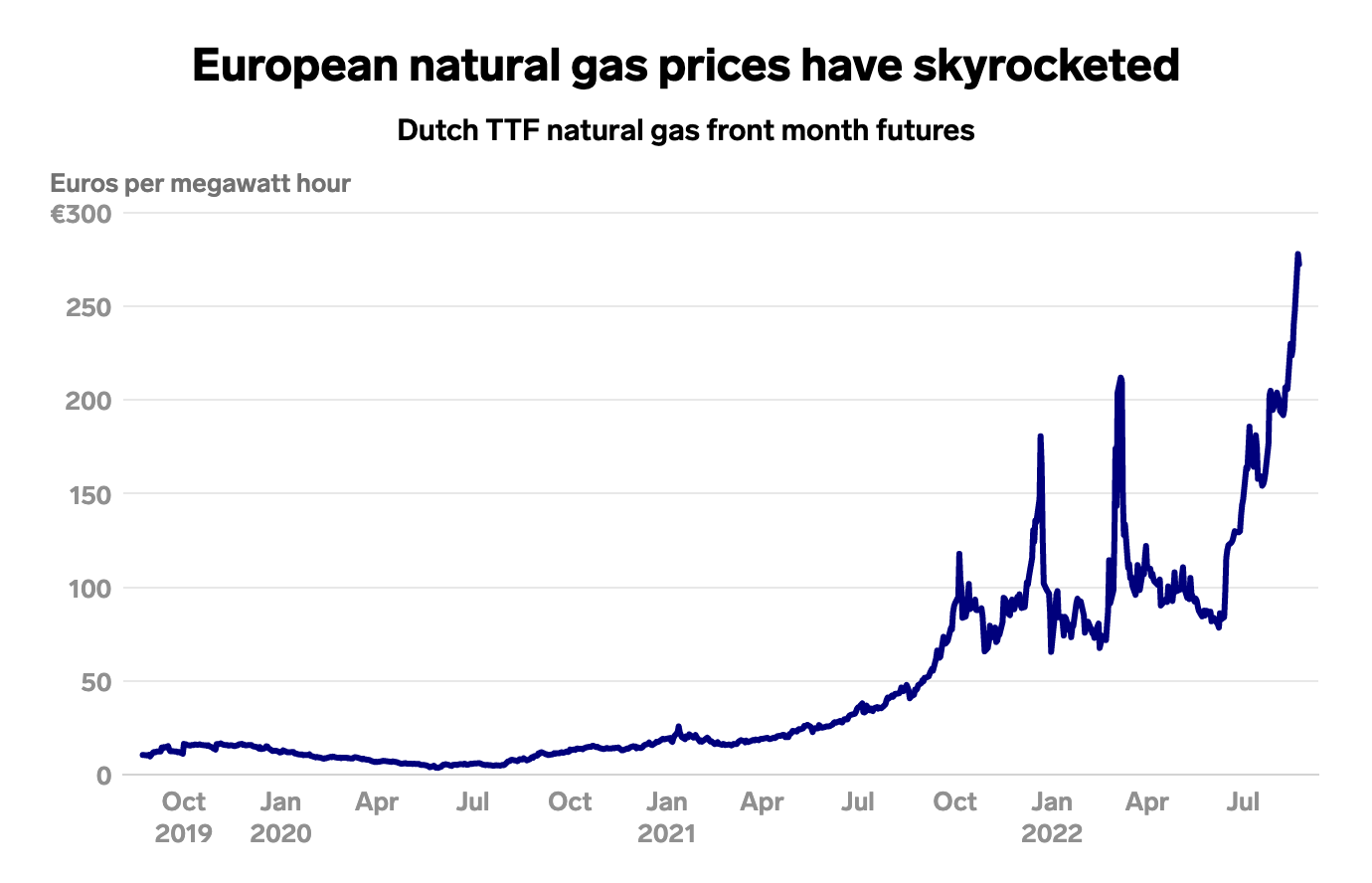 2020 年,歐盟從俄羅斯進口的能源占能源使用量的四分之一。2021 年,俄羅斯供應了歐洲大陸百分之四十的天然氣。俄烏戰爭開打以來,為了回應以應對西方制裁,俄羅斯天然氣公司與 9 月初無限期關閉通往歐洲的天然氣管道,加劇了價格已經飆升的能源危機(表三 歐洲高漲的天然氣價格)。