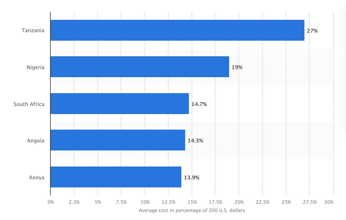 以 2021 年坦桑尼亞和奈及利亞的美元匯款成本為例,從這些國家轉移 200 美元的匯款手續費平均為匯款總金額的 27% 和 19%,嚴重剝削人民參與金融的權利(表三)。