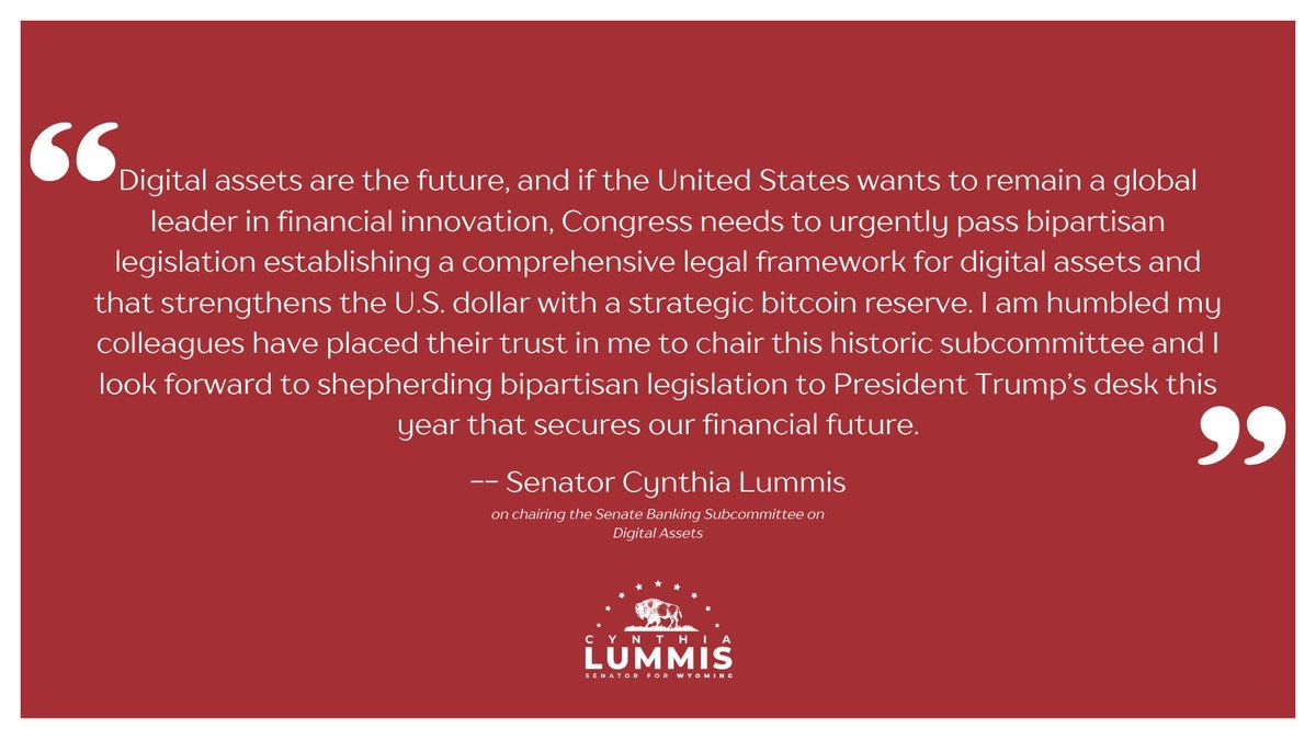 於此同時,負責金融法規的參議院銀行委員會(Senate Banking Committee)也成立了第一個專門負責數位資產的小組委員會(Senate Banking Subcommittee on Digital Asset),同時以提出「比特幣戰略儲備」提案的共和黨參議員 Cynthia Lummis 為小組的主席。Lummis 提到,「數字資產是未來,如果美國想繼續在金融創新方面保持全球領先地位,國會需要緊急通過兩黨立法,為數位資產建立一個全面的法律框架,並通過比特幣戰略儲備來加強美元」。參議院銀行委員會主席 Tim Scott 也表示「區塊鏈技術和加密貨幣有可能使金融世界民主化」。