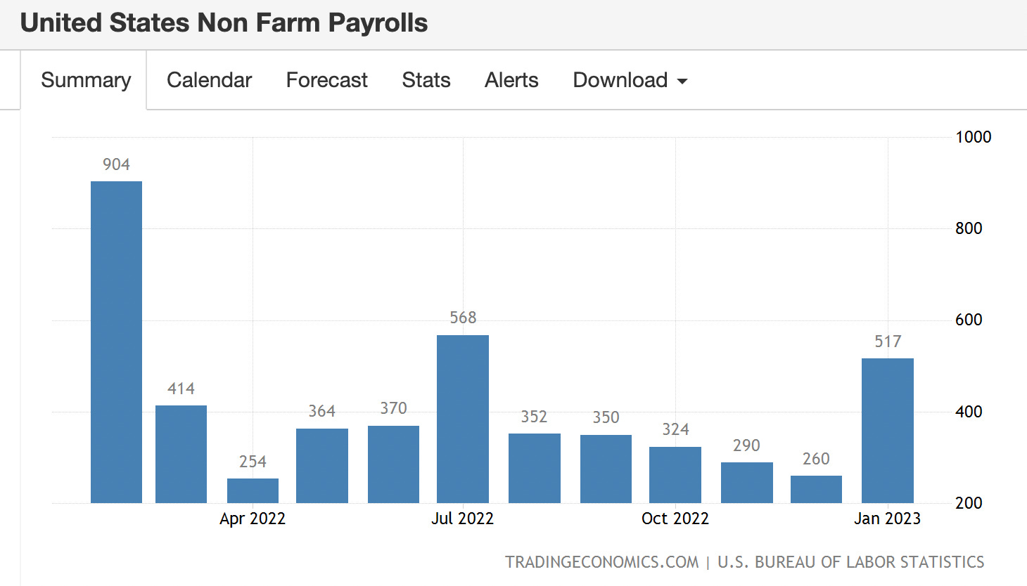 但是,就在聯準會認為失業率必須適度提高的同時,美國勞工部於 2 月 3 日公布的失業率與非農就業人數數據,欲大幅出乎人預料之外。美國 1 月份失業率以 3.4% 創下 1969 年以來的新低 (表三 失業率)。非農就業人數更以 51 萬 7 千人超過預期 18 萬 5 千人接近三倍 (表四 非農就業人數)。