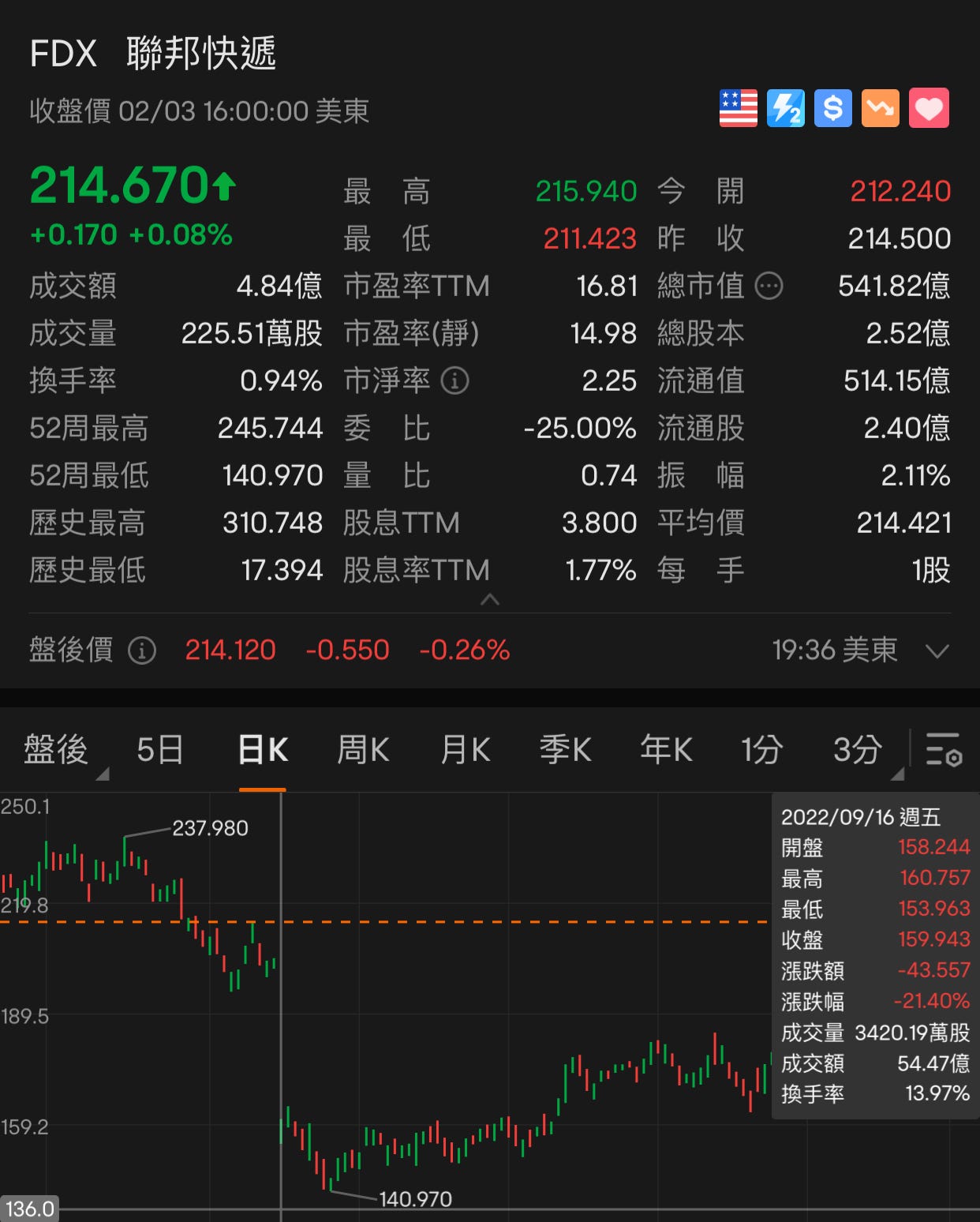 聯邦快遞股價的低點出現在 2022 年 9 月 16 日。當天,公司發佈令人失望的業績報告,CEO 甚至表示全球經濟有進入衰退的可能。公司股價不僅在當天大跌 21.4%,收在 159.94 美元,而且在之後持續下跌,最低到 140.97 美元。但是,聯邦快遞畢竟是全球快遞業的領導企業,上周五股股價回升到 214.67 美元,已經高於公佈令人失望業績前的股價 (表六 聯邦快遞公司近期股價)。