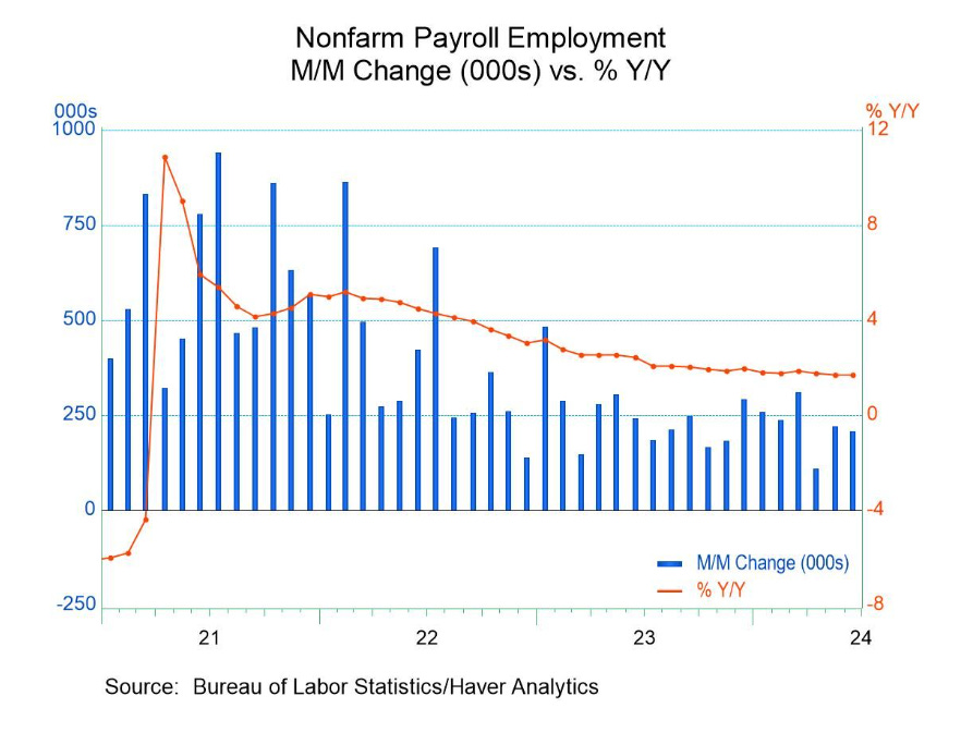 美國平均每月工資就業人數增長在 2022 年為 377,000 人,2023 年為 251,000 人,今年的平均每月工資就業人數增長為 222,000 人。以過去三個月的數據來看,非農就業平均人數已經不到 180,000人,勞工市場明顯降溫當中。