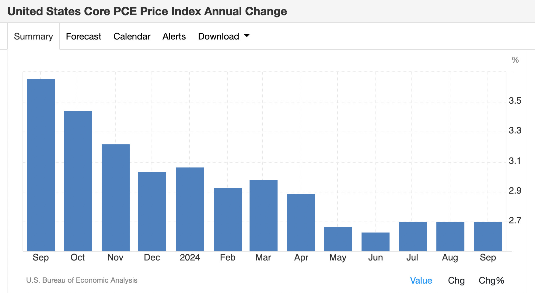 通膨在過去兩年中已經有所緩解。截至 9 月的過去12個月,個人消費支出通膨(PCE)上漲 2.1%。剔除波動度較大的食品和能源後,核心個人消費支出通膨(Core PCE)上漲 2.7%。