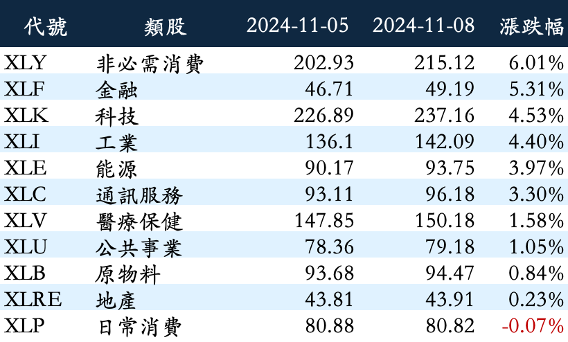 檢視川普過去的執政經驗和選舉期間種種的政策提案,我們看到,除了 Elon Musk 大舉押注川普造成 Tesla 所在的非必需消費類股(XLY,6.01%)漲幅居各類股之冠,以及無論那一黨當選都可能上漲的科技類股(XLK,4.53%)外,預計未來在川普政策下受益的類股包括,金融(XLF,5.31%)、工業(XLI,4.40%)和能源類股(XLE,3.97%)與小型股(IWM,6.19%)(表三)。