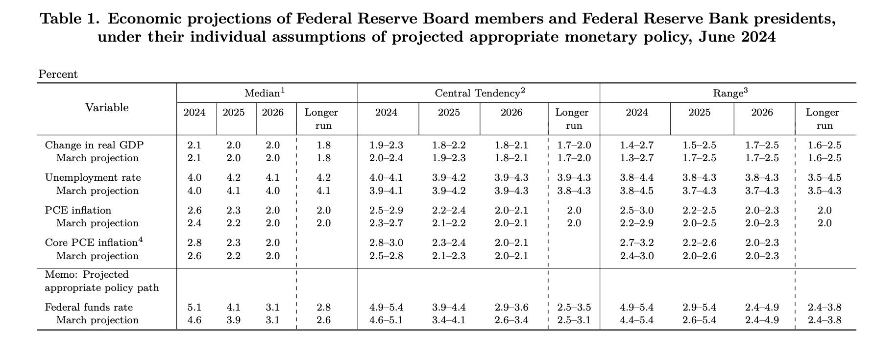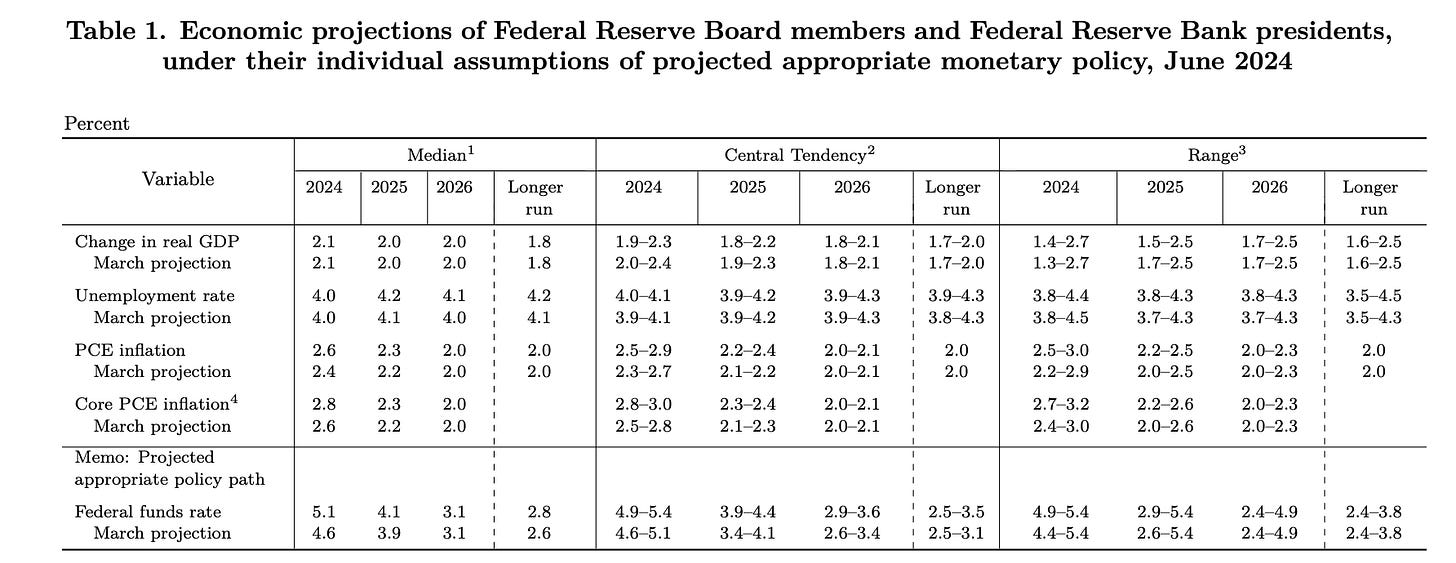 美東時間 6 月 12 日, 在 FOMC 會議後的記者會上,聯準會主席鮑威爾宣佈維持聯邦基準利率(Fed Fund Rate)不變,市場沒有感到意外。但是,令人感到意外的是,在發布的經濟預測上,聯準會修正了對未來通膨的看法,預計到年底的 Core PCE 從上一次會議預測的 2.6% 調高到 2.8%,並將今年降息的次數從之前的三次調整為一次。(表一)。
