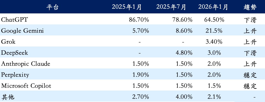 表一 各家 AI 聊天機器人的市場佔有率排名