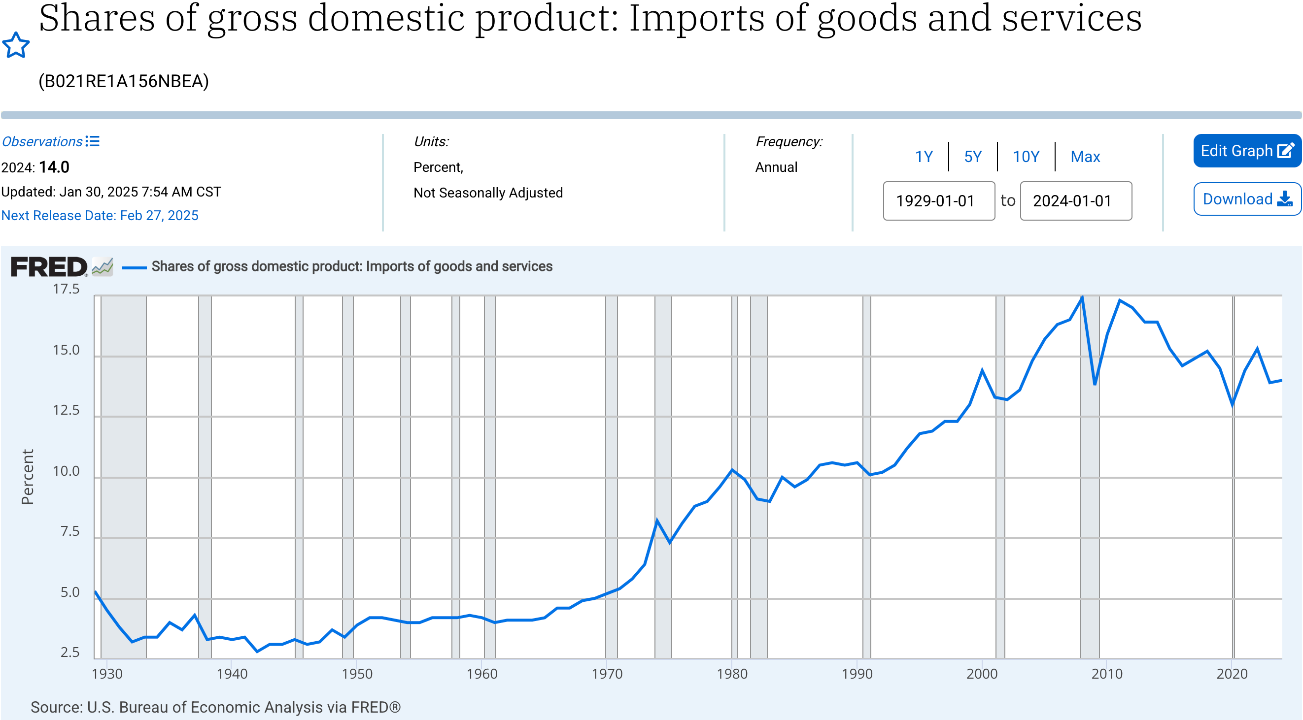 美國的進口總額約佔 GDP 的 14%(表七),如果對所有的貿易夥伴課徵 10% 的進口關稅,表面上看起來似乎將產生 1.4% 的通膨。在川普政府宣佈將從 2 月 4 日起對加拿大和墨西哥加徵 25% 的關稅,並對中國加徵 10% 的關稅後,波士頓聯準會的研究人員更在一項研究中估計,對墨西哥、加拿大和中國徵收的關稅將對核心個人消費支出通膨 (Core PCE)產生 0.5~0.8 個百分點的影響。