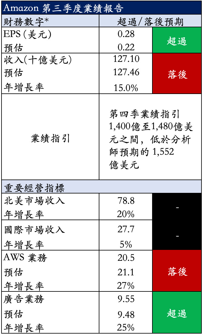 同時,第三季的營業收入雖然較去年同期成長 15%,達 1,271 億美元,但落後分析師預期的 1,274 億美元。令市場失望的是,公司預計第四季營收在 1,400 億至 1,480 億美元之間,僅較去年同期增長 2% 至 8%,而且低於分析師預期的 1,552 億美元 (表一 亞馬遜第三季盈餘報告與業績指引)。
