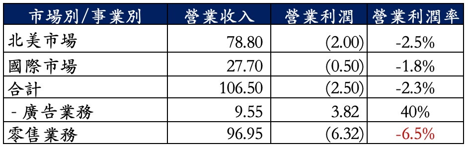 然而,廣告業務的亮麗表現反而更突出了零售業務的困境。在亞馬遜公布以北美和國際市場為區分的營收中,包含了零售和廣告業務,合計金額達 1,065 億美元,在扣除 95.5 億美元的廣告收入後,初步估計零售業務收入為 969.5 億美元。營業損失共 25億美元。營業利潤率為負的 2.3%。
