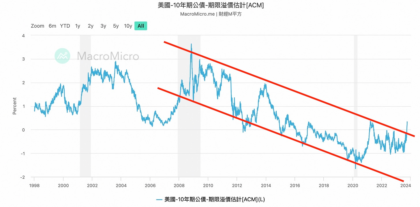 換句話說,「更高」的利率政策帶來預期實質利率的上升;而維持「更久」的高利率政策意味購買長天期公債未來面臨利率變化的風險升高,投資人要求的風險補償(也就是期限溢價)跟著提高,形成公債殖利率大幅上升的另一個重大原因。