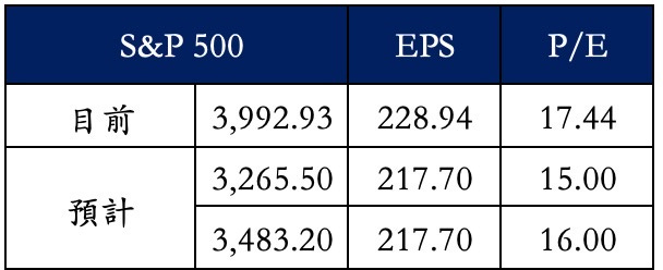 預計華爾街分析師預期的 S&P 500 公司 2023 年 EPS 仍需向下調整,同時,預計熊市底部的超跌區出現在 P/E 倍數下降到 15 倍到 16 倍之間 (表五 預計 S&P 500 指數的超跌區)。