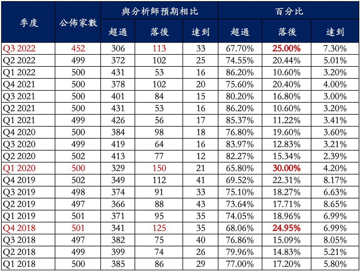在 S&P 500 公司已經公佈第三季盈餘公司的 452 家中 ,低於分析師預期的公司家數共 113 家,比例較之前上升到 25.00%,首度超過了 2018 年第四季熊市谷底期間的 24.95%。