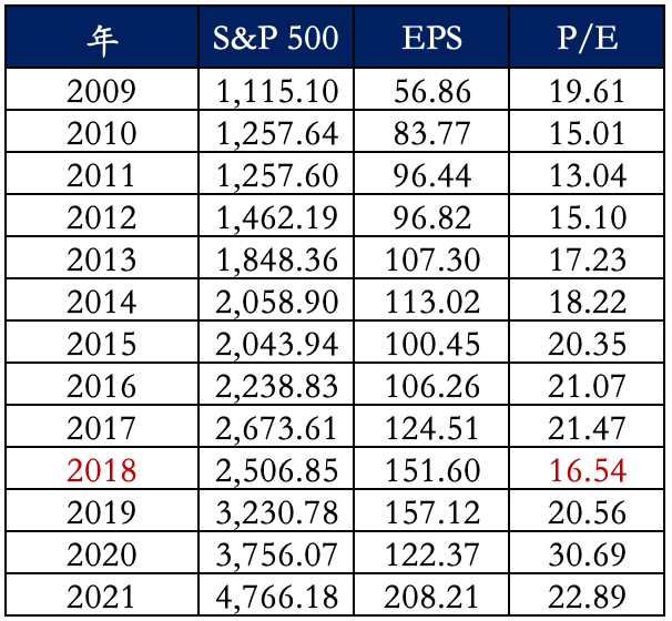 表四 歷年 S&P 500 指數、EPS 與 P/E