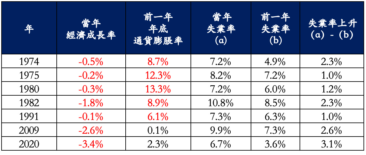 根據研究,在過去的 50 年中,美國的經濟經總共歷經了 7 次衰退。除了 2009 年與 2020 年是因為金融風暴與新冠疫情引起以外,在其餘的 5 次衰退中,前一年的通貨膨脹率都超過了 6% (表三 經濟衰退前一年的通貨膨脹率)。