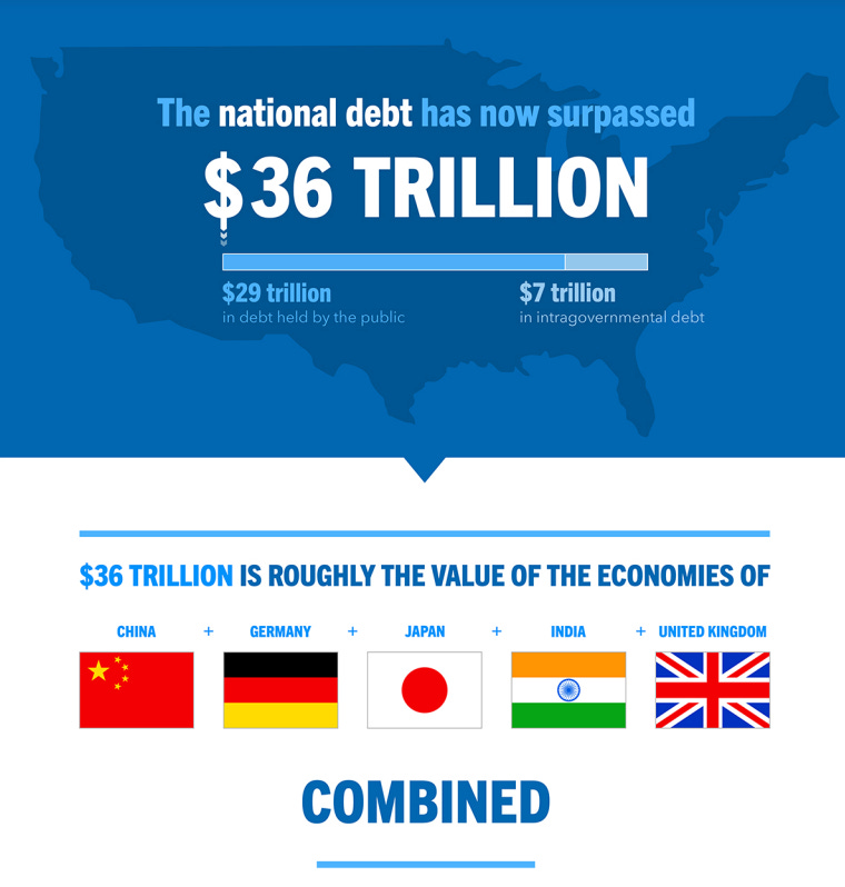 儘管美國的經濟發展良好,但債務問題的嚴重程度超過一般人的想像。美國今天 36 兆美元的鉅額國債約等同於世界主要經濟體中國、德國、日本、印度和英國經濟的總和(表一),而且以目前兩黨運作的情況來看,沒有絲毫和緩的跡象。