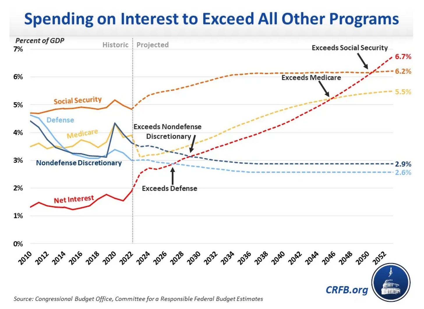 如果美國連支付利息費用都出現問題,將造成債權人不願意再增加借款的金額,形成美國舉債的上限。換句話說,如果趨勢持續,在沒有節制開銷下,美國國力的發展在30 年後可能出現瓶頸。