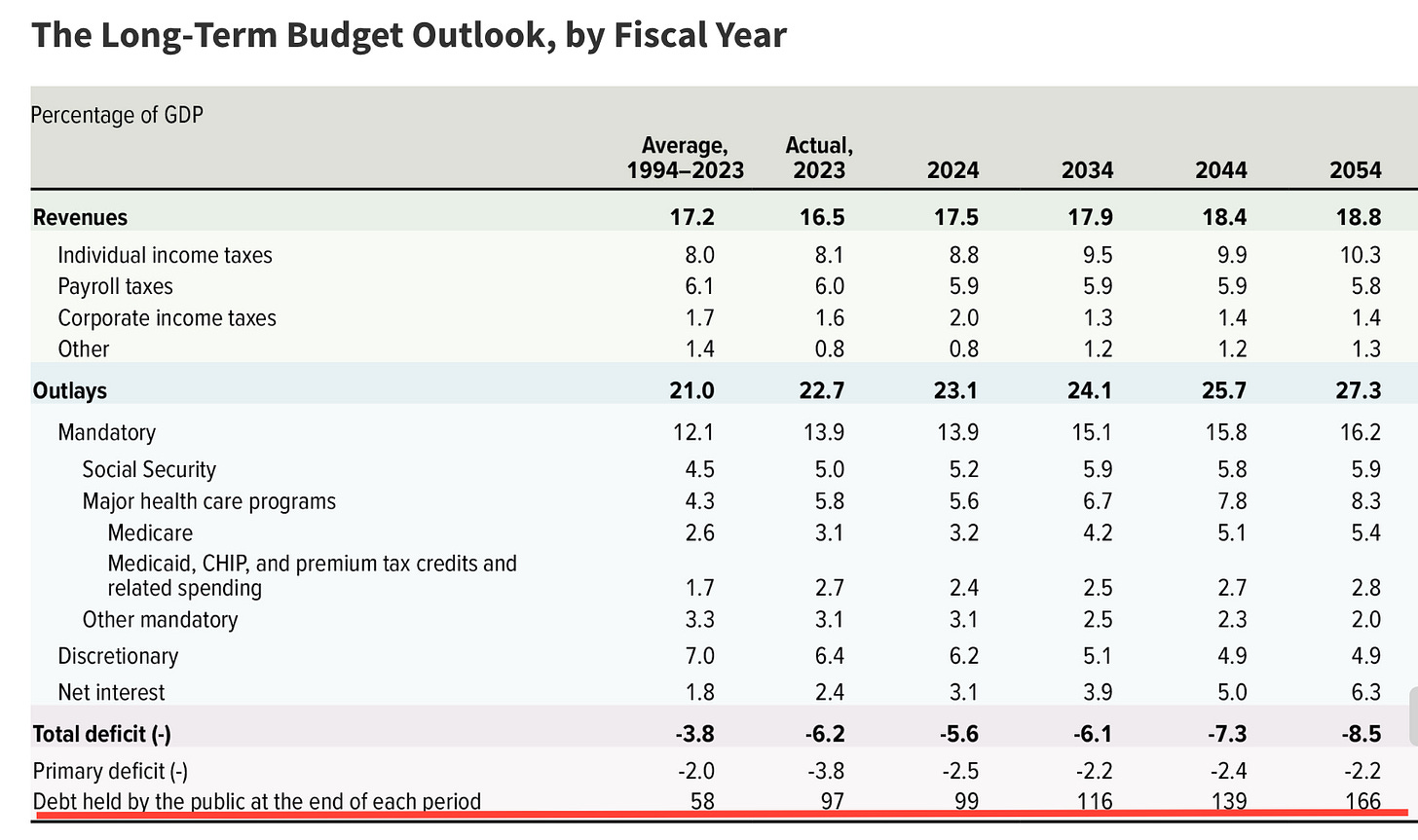 根據 CBO 的估計,到了 2044 年,美國的國家債務將攀高到 GDP 的 139%。美國 2024 年的 GDP 為 29.37 兆美元,如果未來 20 年的經濟以每年 2% 成長,美國的 GDP 將在 2044 年成長到 43.64 兆美元,GDP 的 139% 相當於 60.66 兆美元的債務。