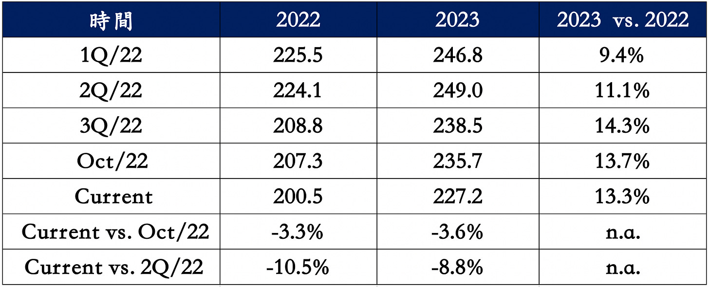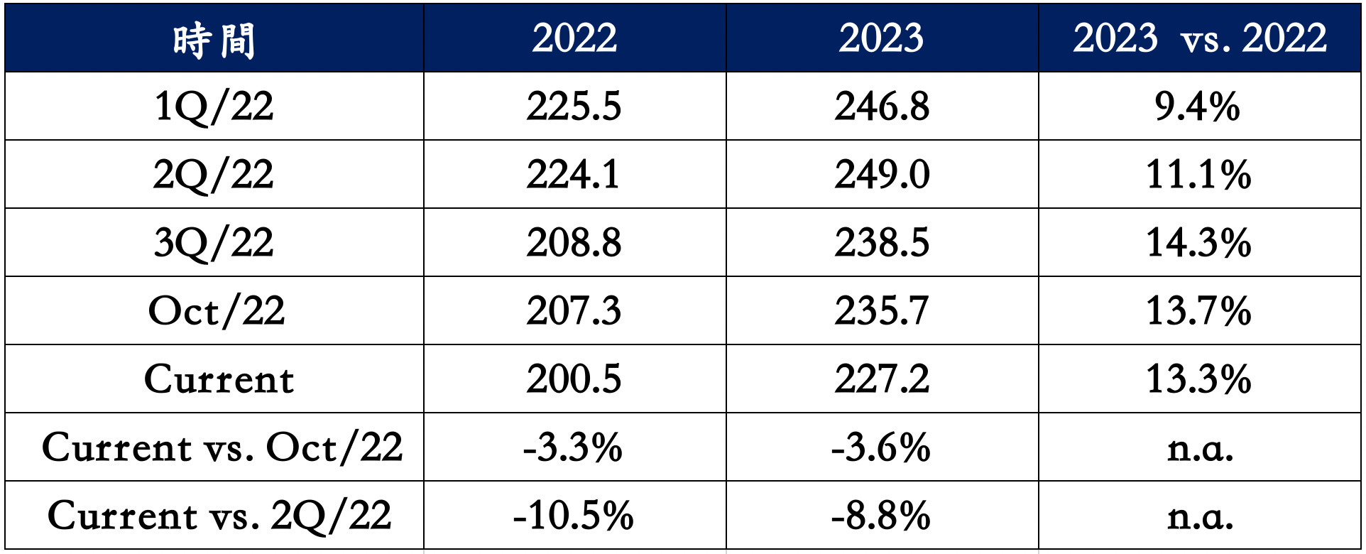 造成的結果是,今年以來,華爾街分析師不斷向下調整 2023 年每股盈餘的預估。光是從 10 月到目前,就下調了 3.6%。如果進一步以今年第二季預估的 249.0 美元和目前的 227.2 美元做比較,調整的幅度更達到 8.8%(表一 分析師在不同時間對 S&P 500 公司每股盈餘的預估)。