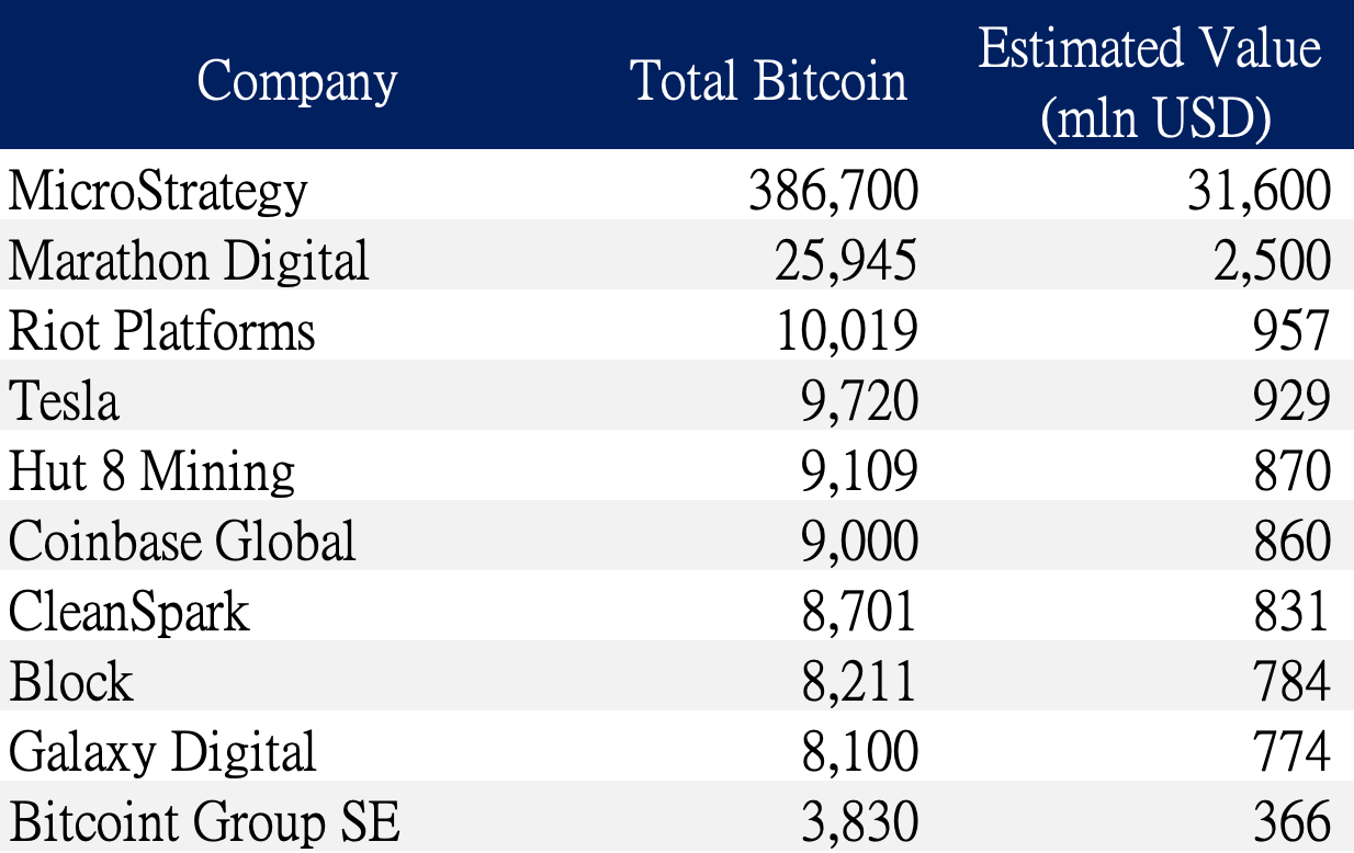 表四 擁有比特幣的前 10 大企業(截至 2024 年 11 月)