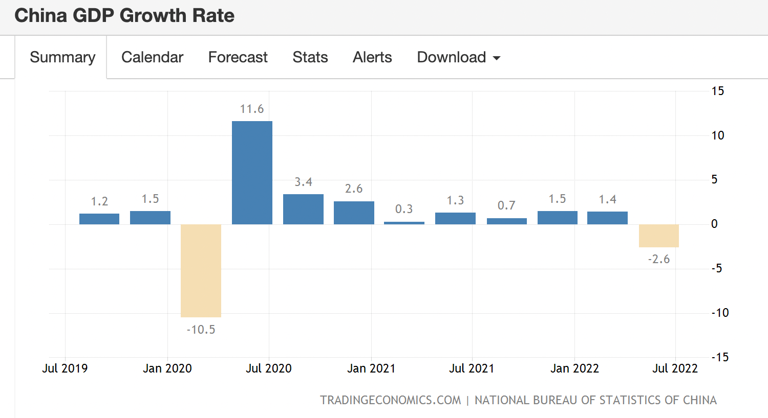 中國雖然受通膨影響較小,年通貨膨脹率從 7 月 2.7% 的兩年高點意外降至 8月的 2.5%。但由於從 2022 年 3 月到 5 月,包括金融和商業中心上海在內的中國主要城市實施了全面或部分封鎖。截至 2022 年 6 月的第二季度,經季節調整後的中國經濟環比萎縮 2.6%,這是自 2020 年第一季度以來的首次季度收縮 (見表六 中國經濟增長率)。