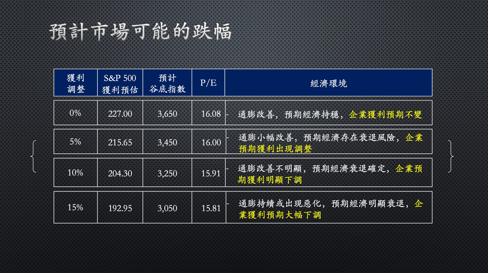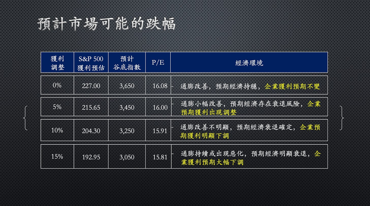以目前通膨發展的趨勢、全球經濟形勢的變化與 S&P 500 公司所面臨的挑戰來看,我們維持原來對 S&P 500 公司獲利下調 5% 至10% 的預估不變,預計指數底部落在 3,250 點至 3,450 點之間(見表一 預計市場的跌幅)。