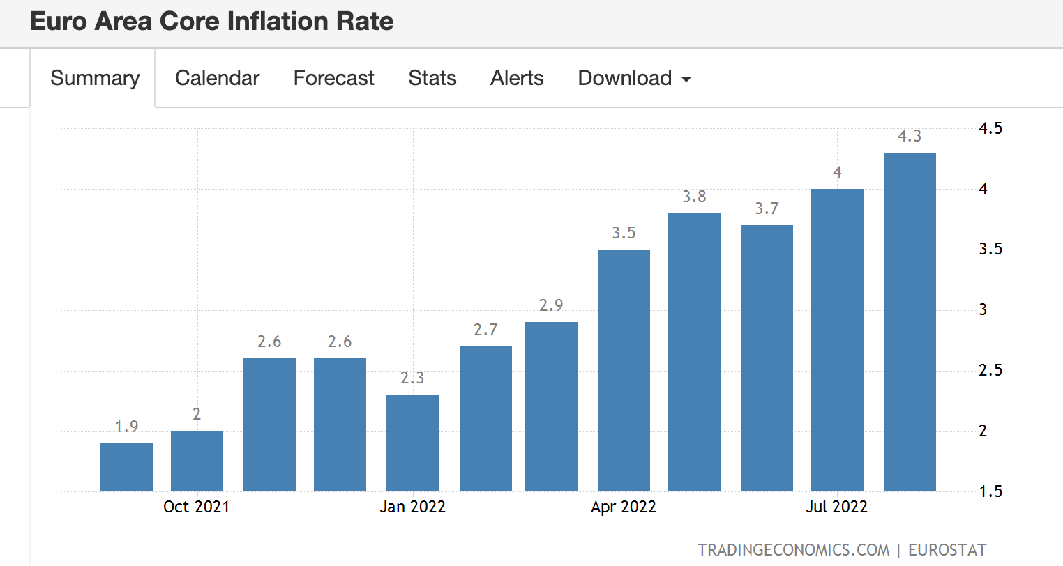歐元區方面,8月份年通貨膨脹率為創紀錄的 9.1% (見表四 歐元區年通貨膨脹率)。其中,貢獻最大的還是能源 (38.6%,7月為 39.6%),但食品、煙酒 (10.6%,7月為 9.8%)、服務 (3.8%,7月為3.7%) 和非能源工業品 (5.1%,7月為4.5%) 的價格有所上漲。剔除能源、食品、酒精和煙草,核心通貨膨脹率從 7 月份的 4% 升至創紀錄的 4 .3%,這表明價格壓力已經擴散到經濟的所有部門 (見表五 歐元區核心通貨膨脹率)。