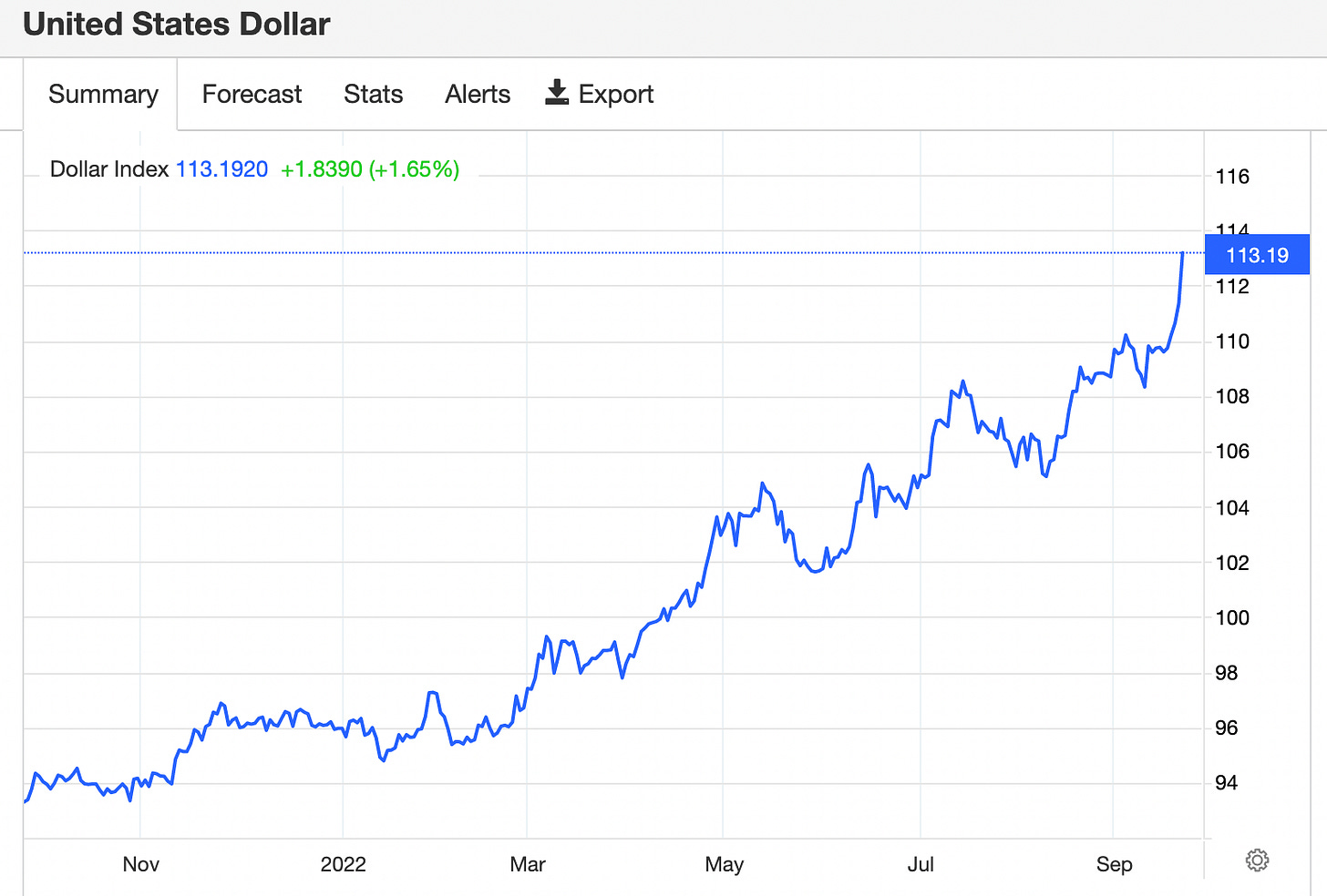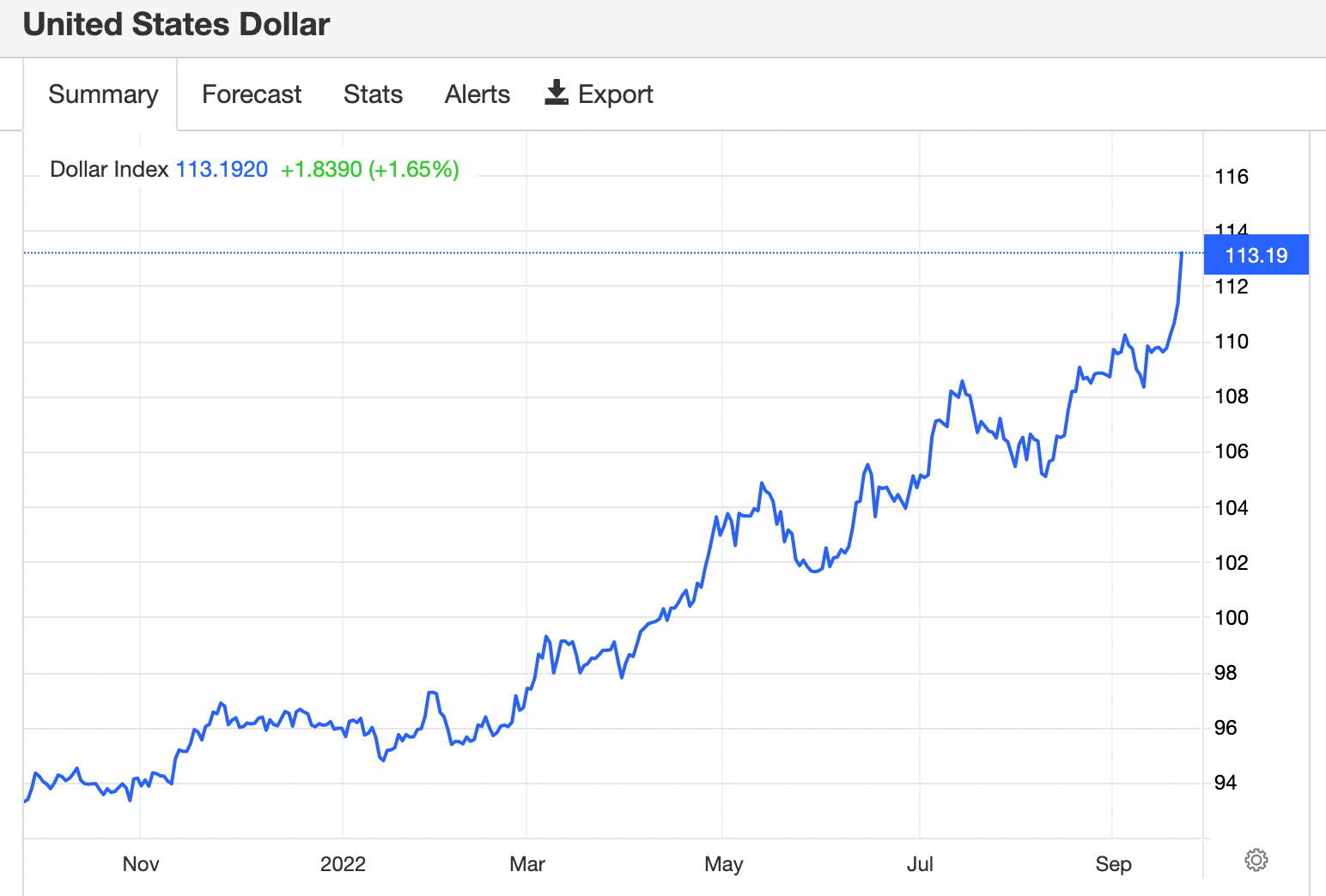 今年以來,美元在加息的環境下一路上漲,目前美元指數高達 113.19,創 10 年來新高(見表七 美元指數)。同時,歐元繼續跌破 0.98 美元的支撐,這是自 2002 年以來的最低水平 (見表八 歐元對美元匯率)。最新數據顯示,隨著物價壓力加劇,歐元區 9 月份經濟下滑加劇。商業活動連續第三個月收縮,前瞻性指標顯示,未來幾個月這種下滑勢頭將進一步增強。