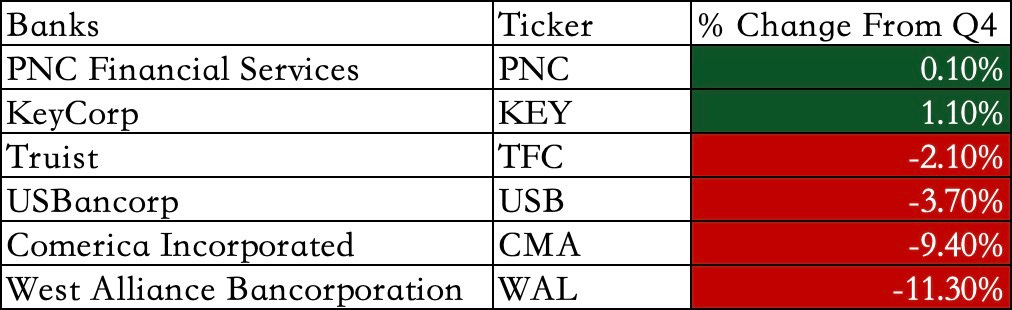 以目前區域銀行存款流失的情況來看,也接近 Diamond 所描述的情況。與 4Q22 相比,在已經公佈盈餘的上市區域銀行中, 除了 West Alliance 在流失了兩位數的存款較為明顯以外,其餘銀行在 1Q23 流失存款的情況在個位數以內。PNC 與 KEY 等銀行的存款甚至還增加 (表二 區域銀行存款流失的情況)。