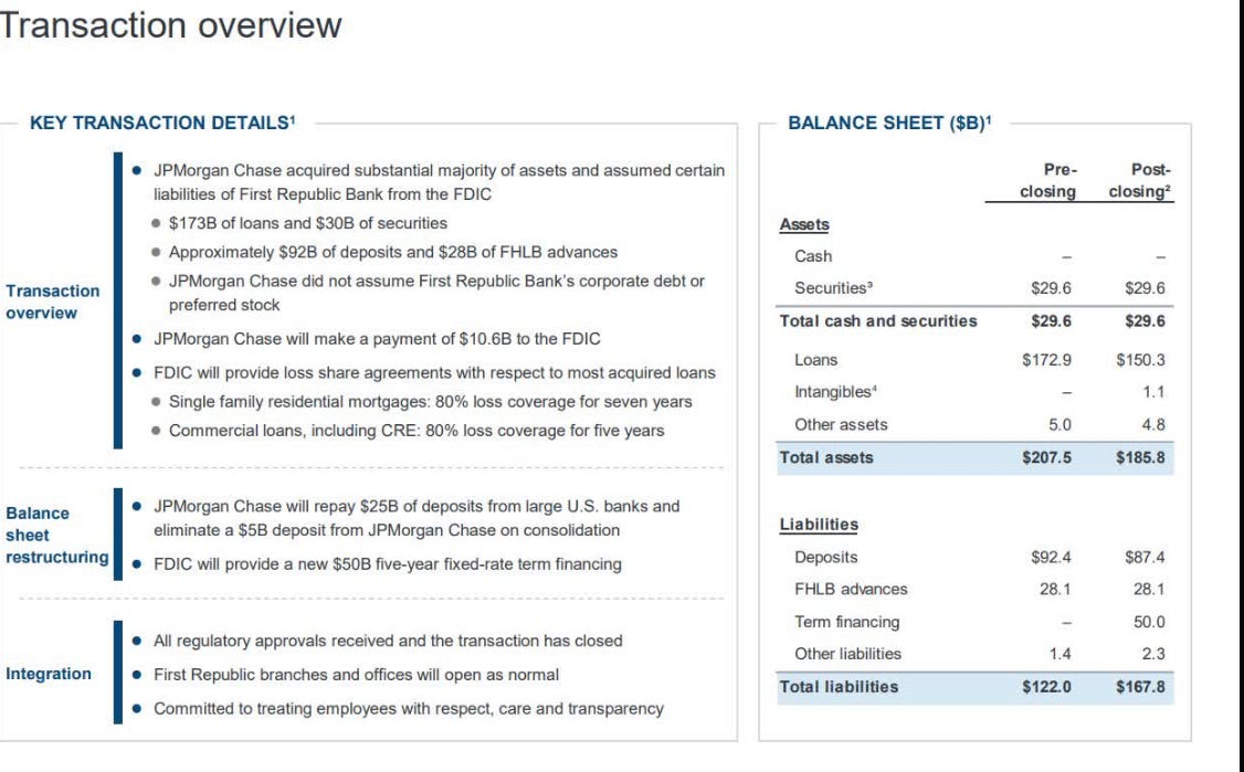 但是,摩根大通銀行並沒有承受第一共和銀行本身對外發行的公司債和特別股。這一方面也表示,摩根大通銀行在收購第一共和銀行的多數資產負債時,第一共和銀行仍然是一家獨立存在的銀行。