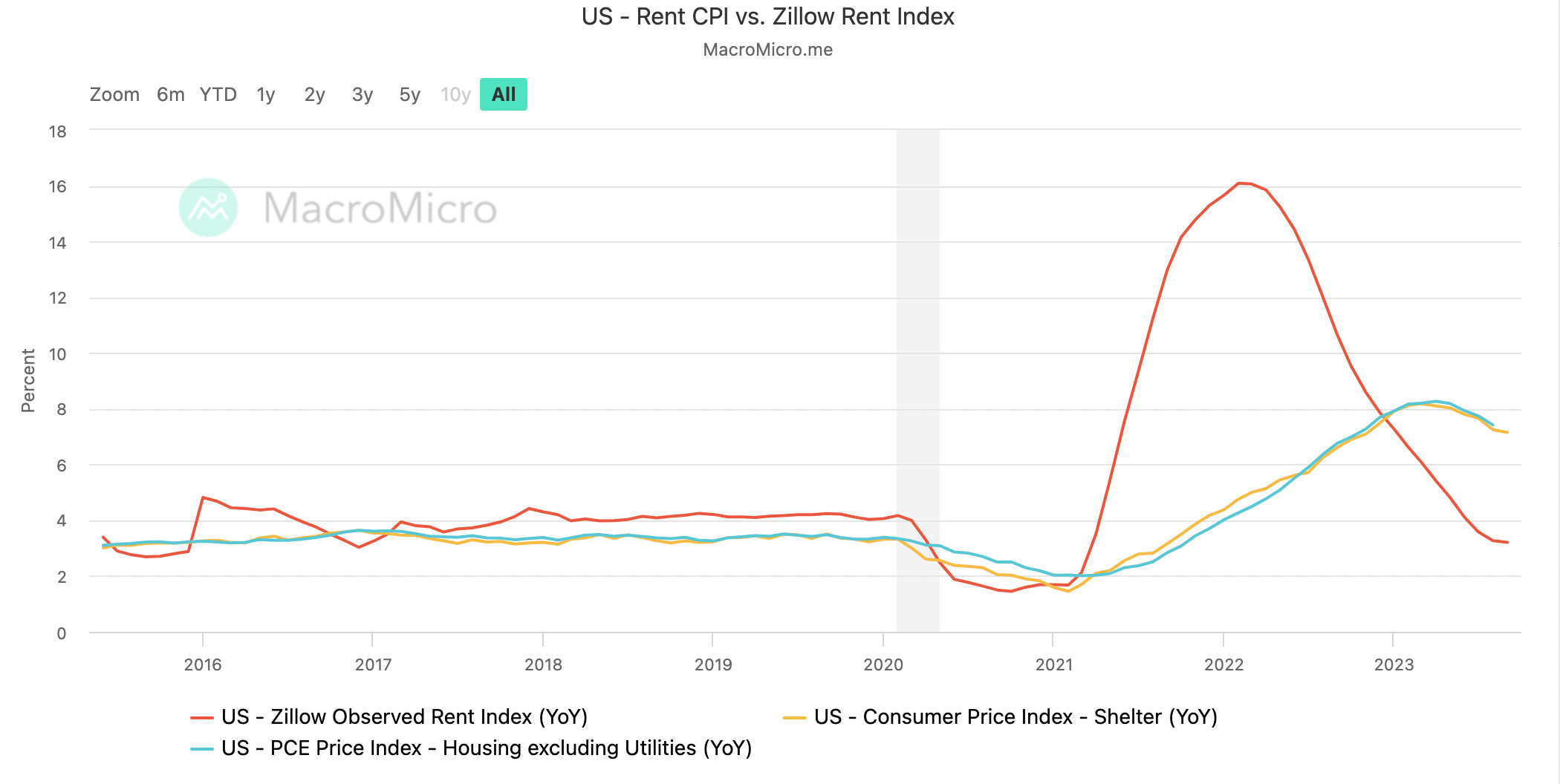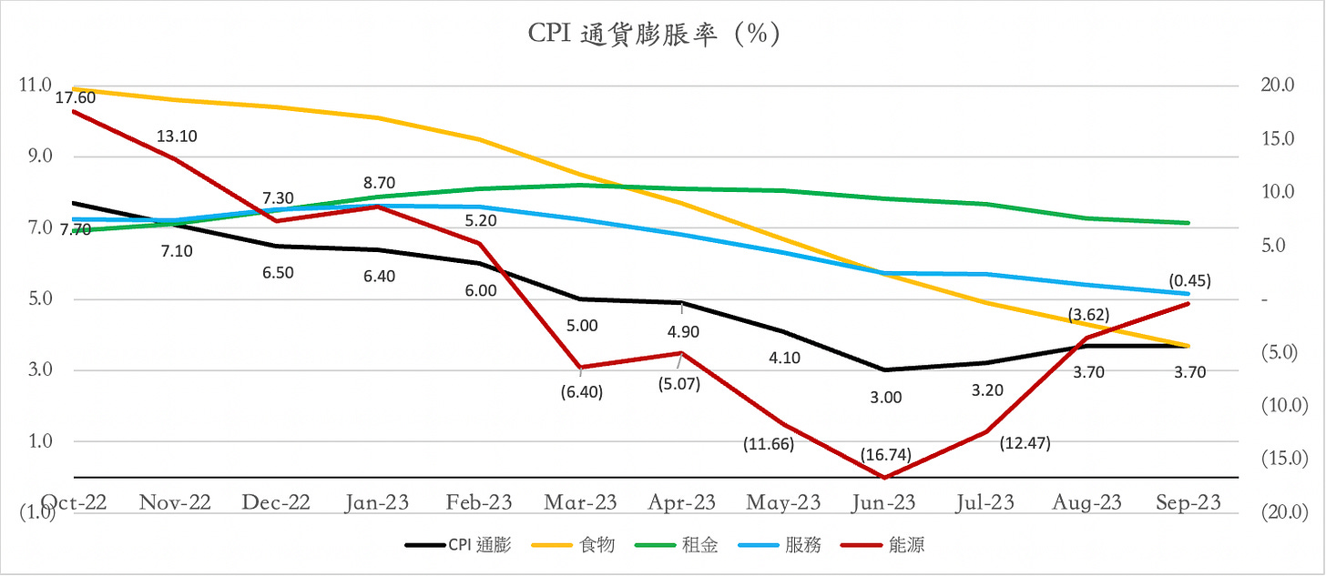 在通膨的大項中,食物的通膨下降順利,由去年 10 月的 10.9% 下降到今年 9 月的 3.7%(表七)。而租金的通膨在 9 月雖然仍高達 7.15%,但作為租金領先指標的 Zillow 租金指數目前仍在下滑之中(表八)。聯準會主席鮑威爾在 9 月 FOMC 記者會上也預計在舊租約到期續約的時候,新租約的租金價格有調降空間。由於租金的通膨佔整體通膨的三分之一,預計租金的下降將對整體通膨的下降做出貢獻。