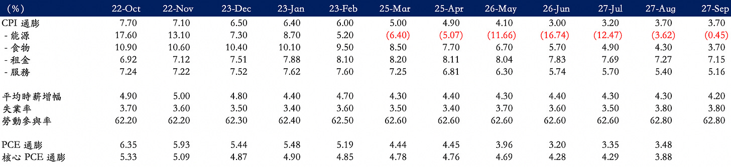 通膨難纏的部份在於服務類通膨,其中,人工薪資佔整體服務通膨約 50%。而人工的薪資一般不會下降,只有透過失業率的提高,來緩和薪資的上漲;或是,由於基期的墊高而使漲幅下降。也因此,勞工平均時薪增長於 9 月繼續放緩到 4.2% 的消息成為市場最近的一大利多。同時,由於勞動參與率的提升(表七),帶動更多的人進入就業市場,也有助於勞工市場供需的平衡。