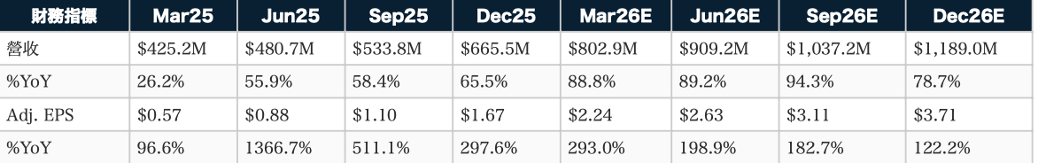 公司深度解讀光進銅退的時代來臨(下)轉虧為盈的產業機遇Michael ChangApr 06, 2026∙ Paid3Share財務分析最新季度(2025年12月)表現強勁,營收達 6.655 億美元,年增 65.5%,顯著超越分析師預期。毛利率達 36.08%,營業利潤率轉正至 9.66%,顯示公司已走出 2024 年的低谷期。管理層對下一季(2026 年 3 月)給出 7.80-8.30 億美元的營收指引,預計將創下歷史新高。分析師預估該季營收 8.029 億美元,年增 88.8%,營業利潤率將維持正值,顯示復甦動能強勁。季度預估Continue reading this post for free, courtesy of Michael Chang.Claim my free postOr purchase a paid subscription.Previous