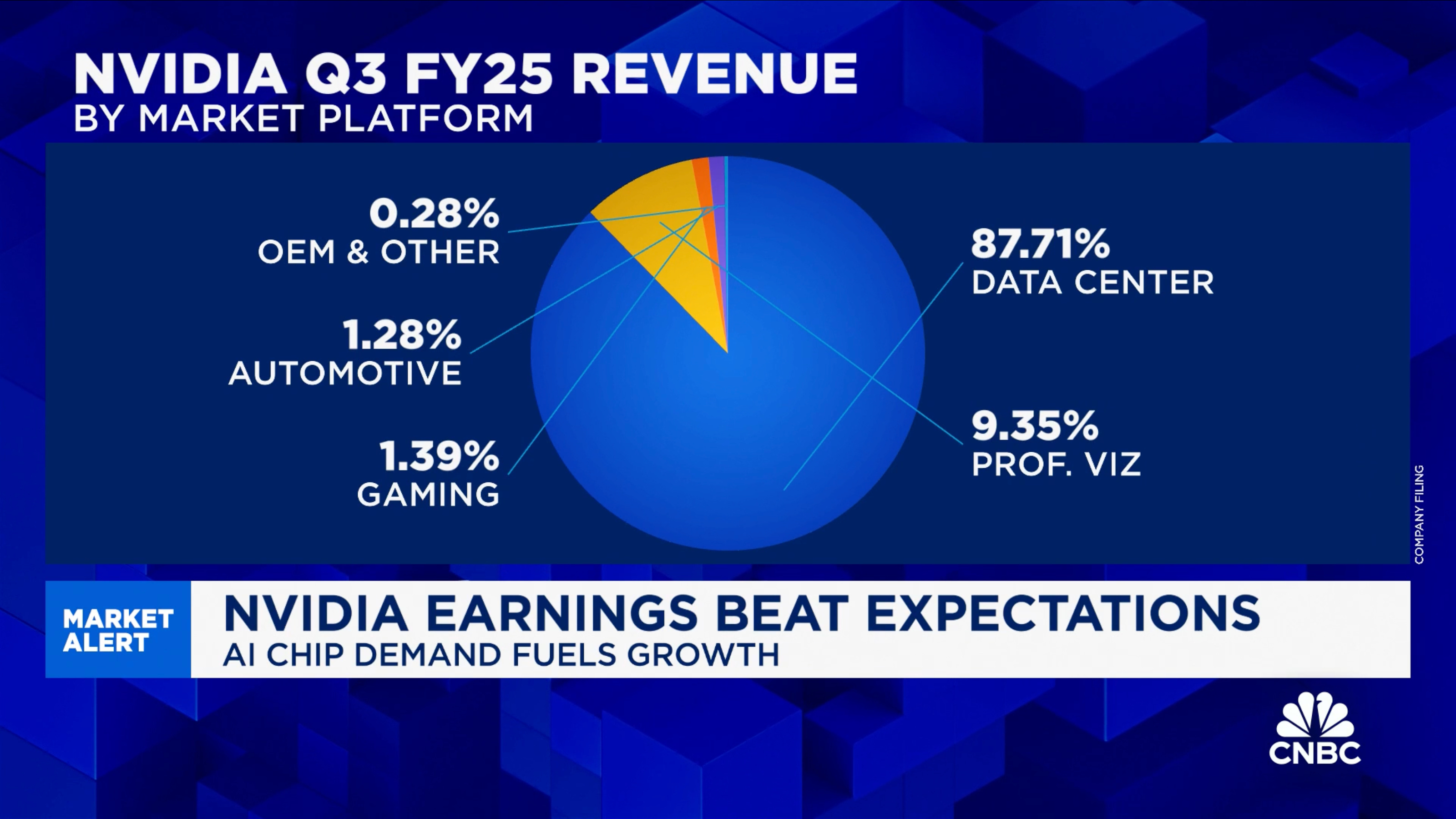 Nvidia 三季度(08/24~10/24)的業績報告再度驚艷世人,營收 351 億美元,年增 94%,月增 17%,也超過華爾街 331 億美元的預期。在加速運算和人工智能的推動下,所有產品類別都出現強勁的增長。全球關注的資料中心業務更是以橫掃千軍之勢成長,三季度營收達創紀錄的 308 億美元,年增 112%,月增 17%,佔整體營收比例高達 87.7%。