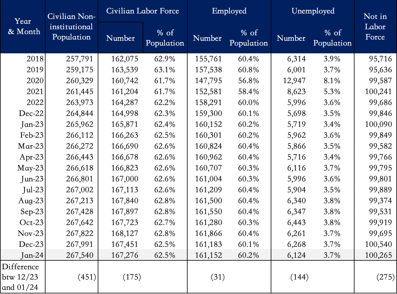 由於美國是個得天獨厚的移民國家,16 歲以上的適齡勞動人口在 2022 年和 2023 年平均增長了 250 萬人以上。1 月份適齡勞動人口較上月大幅減少,估計只是短暫統計樣本上誤差的結果,沒有趨勢的代表性。