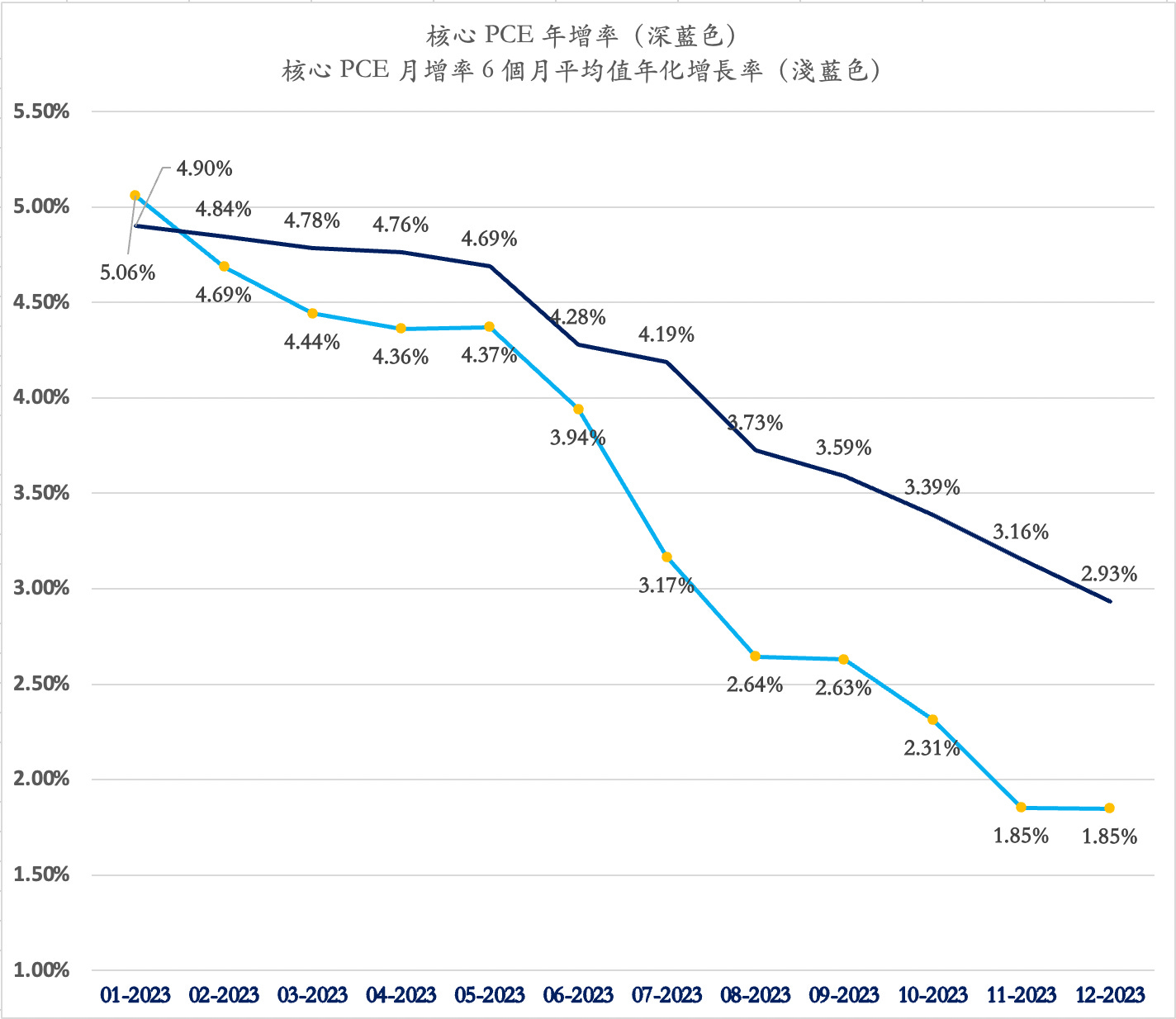 即使從 2023 年 1 月開始,核心 PCE 通膨年增率與 6 個月平均月增率的年化增長率都已經呈現持續下降的趨勢(表一)。同時,作為領先指標的 6 個月平均月增率為 0.15%,年化的核心 PCE 通膨已經下降到 1.85%。
