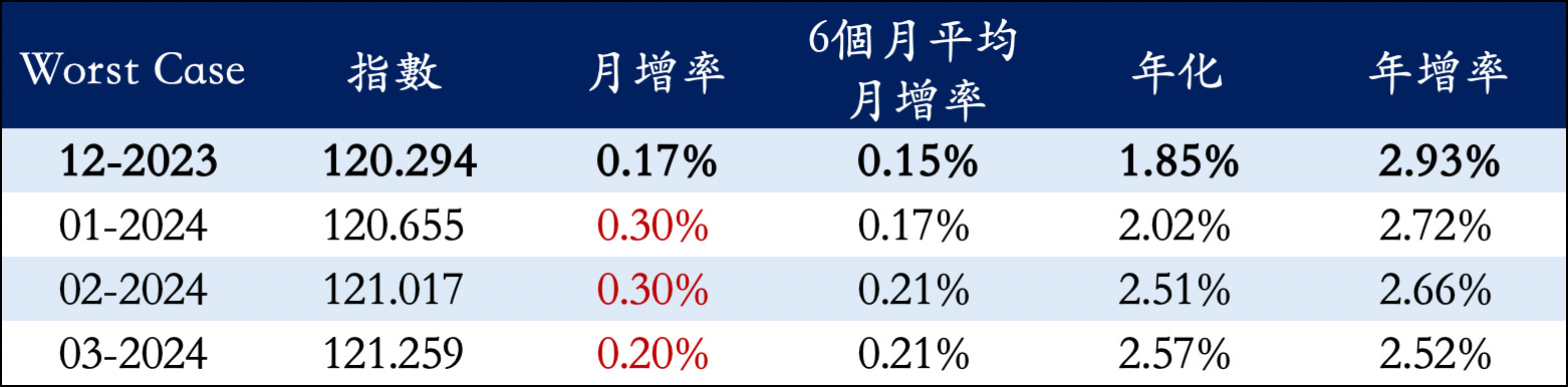而且,在過去 6 個月中,核心 PCE 通膨月增率最高為 0.30%。在最保守的假設下,即使通膨出現反覆,未來 3 個月核心 PCE 通膨月增率分別升高到 0.3%、0.3% 與 0.2%,預計 3 月核心 PCE 通膨也將進一步下降到 2.52%(表二),接近聯準會預期年底核心 PCE 通膨 2.40% 的水準,達到降息的要求。