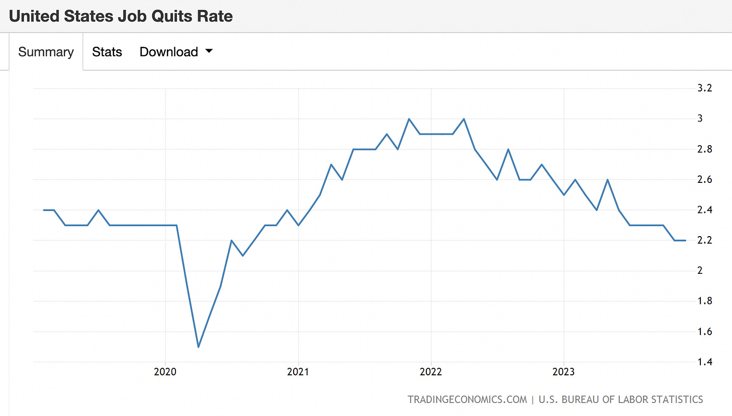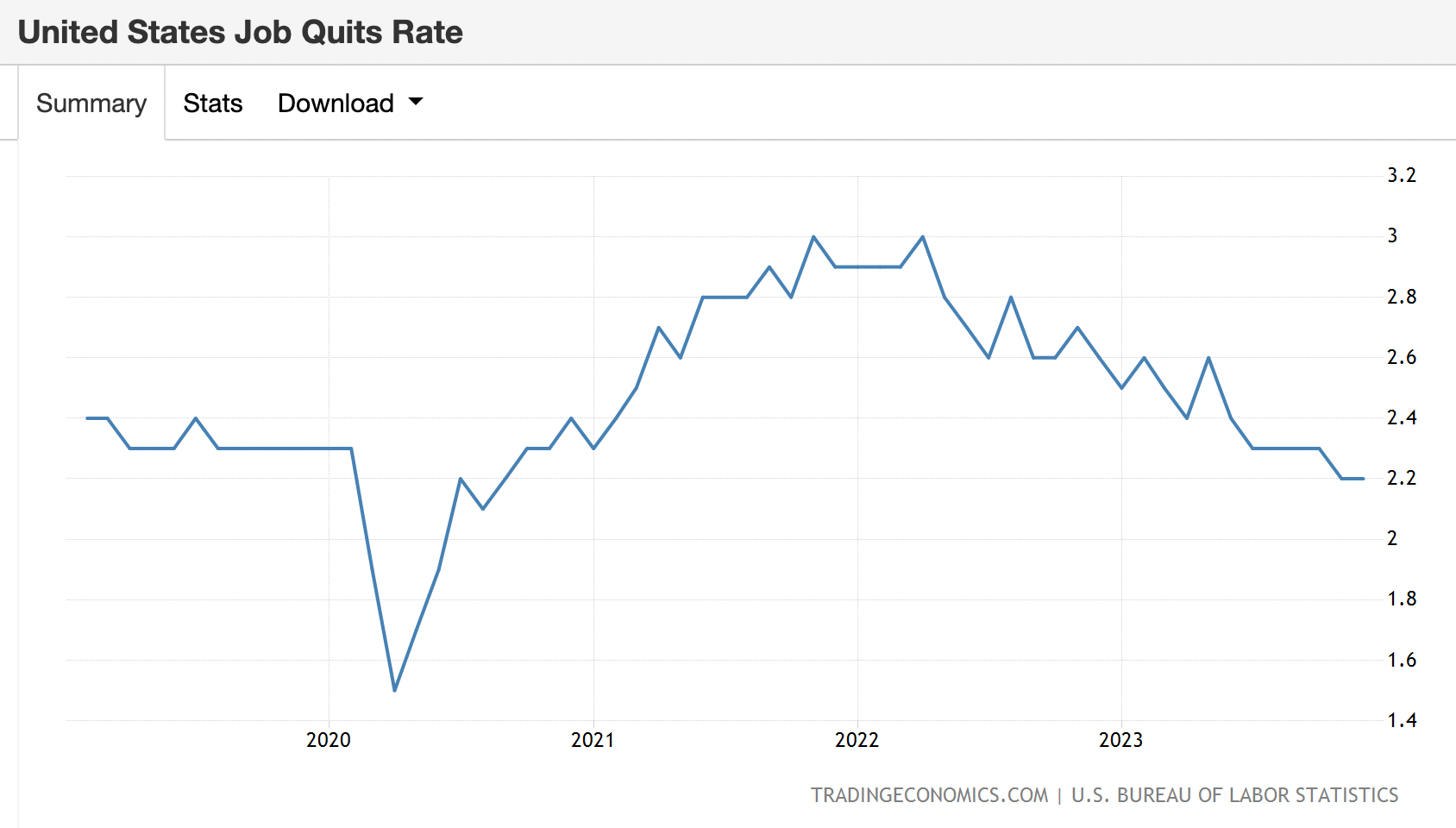 如果再看最近的資料,在物價與高利率的壓力下,勞工的離職率在 12 月保持在 2.2% 的水準不變,為 2020 年 9 月以來的最低水平,也低於疫情前的水準。勞工離職率偏低,也有助於緩和薪資的增長。